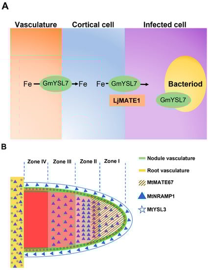 Iron is transported as a form of ferric citrate complex into the xylem of plants [20]. Therefore, iron is also most likely to be imported into the nodule as a ferric citrate complex from the vasculature via the crossing of a number of cell layers to the infected cells [21,22]. Several transporters responsible for iron uptake and transport to nodules have been identified. The citrate transporters, MtMATE67 in Medicago truncatula and LjMATE1 in Lotus japonicus, which are located in nodules (Figure 1), assist the translocation of iron from the roots to nodules via the transportation of citrate to improve the solubility and availability of iron [23,24]. An iron and manganese transporter MtNRAMP1, a member of the Natural Resistance-Associated Macrophage (NRAMP) protein and located on the plasma membrane of nodules, is mainly expressed in zone II (Figure 1B) and has lower expression level in zone I, zone III, the nodule cortex and root vasculature (Figure 1B). Nitrogenase activity is reduced in MtNRAMP1 knockout mutant nramp1-1. Exogenous iron supply can rescue the nitrogen fixation to normal levels in nramp1-1 mutant nodules. This indicates that MtNRAMP1 is involved in the iron uptake of the infected cells in nodules [25]. Recently, Yellow Stripe 1-like (YSL) transporters MtYSL3 in Medicago truncatula and GmYSL7 in soybean have been demonstrated as being important for iron transport from roots to nodules [26,27]. It was confirmed that GmYSL7 is located in both cortical cells and infected cells, whereas MtYSL3 is only localized in the vascular tissue (Figure 1) [26].