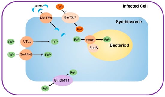Iron uptake for symbiosome and bacteroid. VTLs and GmFPN2 transport ferrous iron from infected cell cytoplasm into symbiosome, MATEs transport citrate from infected cell into symbiosome, YSLs contribute the transportation of ferric iron from infected cell into symbiosome, FeoAB system transports ferrous iron from symbiosome into bacteroid, GmDMT1 transports ferrous iron from symbiosome to infected cell.