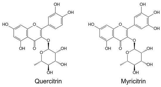Pharmacological investigations showed that M. pigra contains several secondary metabolites, which have pharmacological activity such as analgesic, antipyretic, anti-inflammatory, anti-diabetic, anticancer and antioxidant activity [104,105,106]. The methanol extracts of M. pigra leaves showed antioxidant and anti-inflammatory actions in the Wister rat, and quercitrin (quercetin 3-O-rhamnoside) and myricitrin (myricetin 3-O-rhamnoside) were isolated from the extracts [104] (Figure 3). The methanol extracts of M. pigra leaves also showed anti-dermatophyte activity, and astragalin, luteolin and quercitrin were isolated from the extracts [105].