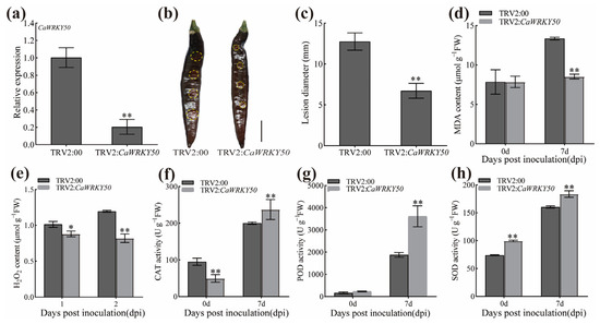 Phenotypic and physiological index analysis of CaWRKY50-silenced pepper fruits. (a) The silencing efficiency of CaWRKY50 in pepper fruits was detected by qRT-PCR at 15 days post-infiltration. (b) The disease symptoms of CaWRKY50-silenced fruits infected with C. scovillei at 7 dpi (bar = 20 mm). The lesion regions are denoted by the yellow dotted line. (c) Lesion diameters were measured at 7 dpi. (d) MDA content. (e) H2O2 content. (f) CAT activity. (g) POD activity. (h) SOD activity. CaUBI3 (AY486137) was used as the internal control. Data are shown as means (±SD) from three biological replicates. Significant differences are shown by asterisks (* p < 0.05, ** p < 0.01, Student’s t test).