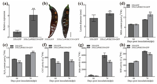 To further explore the role of CaWRKY50 in disease resistance to anthracnose, we performed transient overexpression of CaWRKY50 in detached pepper fruits (cv. R25) and infected them with C. scovillei. CaWRKY50 was successfully overexpressed in the pepper fruits, as confirmed by qRT-PCR analysis at 3 days post-infiltration (Figure 4a). The disease symptoms and lesion diameters of CaWRKY50-overexpressing fruits were markedly larger than those of control fruits at 7 dpi (Figure 4b,c). Additionally, MDA and H2O2 levels in CaWRKY50-overexpressing fruits were dramatically increased compared to the control fruits at 7 dpi (Figure 4d,e). Furthermore, the CAT, POD, and SOD activities of CaWRKY50-overexpressing fruits were significantly lower than those of control fruits at 7 dpi (Figure 4f–h).