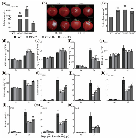 To better understand the function of CaWRKY50 in anthracnose resistance, CaWRKY50 was stably expressed in tomato by Agrobacterium-mediated genetic transformation. Three transgenic T2 lines (OE-97, OE-110, and OE-113) with high levels of CaWRKY50 transcript (Figure 6a) were infected with C. scovillei to assess the role of CaWRKY50 in anthracnose resistance. At 3 dpi, the transgenic fruits exhibited greater lesion diameters than WT fruits (Figure 6b,c). MDA and H2O2 content were evaluated in OE and WT fruits, and compared to WT fruits, MDA and H2O2 levels were greatly increased in OE fruits at 3 dpi (Figure 6d,e). Moreover, the activities of CAT, POD, and SOD were obviously lower in OE fruits than WT fruits at 3 dpi (Figure 6f–h).