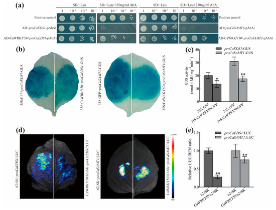 CaWRKY50 directly binds to CaEDS1 and CaSAMT1 promoters and negatively regulates their transcriptional activity. (a) Yeast one-hybrid (Y1H) analysis of CaWRKY50 directly binds to the promoter of CaEDS1 and CaSAMT1. The transformed yeast cells were screened on SD/-Leu medium with 150 and 250 ng mL−1 AbA. The positive control is the co-transformation of pGADT7 and pAbAi-p53, and the negative control is the co-transformation of pGADT7 and pAbAi-bait. (b,c) GUS analysis of the influence of CaWRKY50 on the activity of the proCaEDS1/proCaSAMT1. (b) Histochemical GUS staining. (c) Quantification of GUS activity. (d,e) The effect of CaWRKY50 on the activity of the CaEDS1 and CaSAMT1 promoters by dual-luciferase assay in tobacco (Nicotiana benthamiana) leaves. The LUC to REN ratio was assessed as transcriptional activity. The empty vector 62-SK was used as a control. Data are shown as means (±SD) from three biological replicates. Significant differences are shown by asterisks (* p < 0.05, ** p < 0.01, Student’s t test).