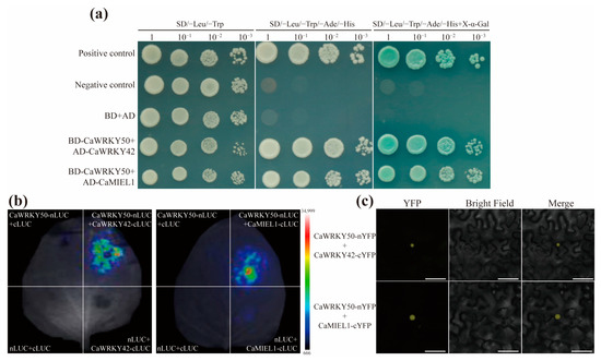 In order to identify the interacting partner of CaWRKY50 in the regulation of pepper defense responses, we screened a pepper cDNA library by Y2H assay and isolated CaWRKY42 (Capana08g001044) and CaMIEL1 (XM_016719768) as CaWRKY50-interacting proteins. CaMIEL1 encodes a RING E3 ubiquitin-protein ligase. Subsequently, we carried out a Y2H assay to confirm whether CaWRKY50 interacted with CaWRKY42/CaMIEL1. The yeast cells co-transformed with CaWRKY50-pGBKT7 and CaWRKY42/CaMIEL1-pGADT7 plasmid combinations were viable on SD/-Leu/-Trp/-Ade/-His medium and turned blue in X-α-gal (20 μg mL−1) (Figure 8a). This confirmed that CaWRKY50 strongly interacted with CaWRKY42 and CaMIEL1.