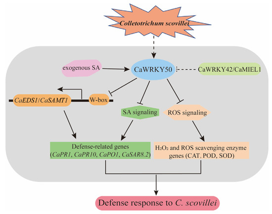 In conclusion, using overexpression and silenced techniques, we demonstrated that CaWRKY50 serves as a negative regulator in response to C. scovillei through the SA and ROS signaling pathways. CaWRKY50 directly binds to the promoters of CaEDS1 and CaSAMT1 to suppress their expression. Furthermore, CaWRKY50 participates in disease resistance by interacting with CaWRKY42 and CaMIEL1 (Figure 9). Our findings shed light on the mechanisms by which WRKY50 functions in response to anthracnose resistance.