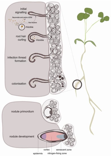 Briefly, the process of nodulation begins with signalling between the symbiotic partners, including plant alteration of the defence mechanisms that are usually triggered in response to pathogens. This results in the bacterial symbiont being able to enter the host, through what is mostly a host-controlled process [8] (e.g., for the legume M. truncatula, Figure 1). Flavonoids and isoflavonoids are produced via the phenylpropanoid pathway by the plant during times of low N, and released into the surrounding environment [9,10]. The flavonoids and isoflavonoids act as a chemoattractant for the rhizobia; however, it must be noted that there has been recent research suggesting that the importance of flavonoids and isoflavonoids as chemoattractants has been inflated and there may be other attractants such as amino acids that are more important in this process [11]. After a signal being initiated from the plant, the rhizobia can be considered to signal back to the plant with lipochitooligosaccharide Nod factors (NFs). The NF structure varies, enabling species specificity, and NFs are recognised by the host via NF receptor proteins such as LYK3 and NFP in M. truncatula [12]. These NFs, however, need to be degraded otherwise rhizobial infection can be delayed [13].