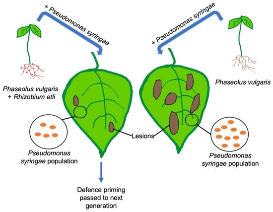 Plants that house symbiotic bacteria have to walk a delicate tightrope of allowing these bacteria in, at the same time as keeping pathogens out. However, the interaction is even more complicated since it has been found that symbiotic bacteria can provide the priming of defences for its host plant. Defence priming can include different aspects, including the accumulation of salicylic acid (a phytohormone key to the defence response [75]) and enabling plant defence genes to be activated more quickly in the face of subsequent pathogen interaction. For instance, it was found by [76] that Rhizobium etli protected Phaseolus vulgaris L. (common bean) from Pseudomonas syringae (Figure 2). In this example, the bacterial population of P. syringae within the leaf tissue was halved in plants inoculated with R. etli in comparison to the uninoculated control, and the lesions caused by the pathogen in the leaf were 75% smaller in inoculated plants. Not only did R. etli protect P. vulgaris when directly inoculated, this defence priming was also passed down to the next generation. Unlike the parent plants, the next generation had not been exposed to R. etli, yet the plants still exhibited an about three-fold decrease in the abundance of P. syringae in the leaf tissue and approximately an 80% reduction in the size of the lesion tissue formed in comparison to the control. M. truncatula and P. sativum have also been found to benefit from symbiotic bacteria defence priming. When inoculated with Sinorhizobium meliloti and Rhizobium leguminosarum, the amount of free salicylic acid in the plant shoots increased in comparison to uninoculated plants by approximately 10% in M. truncatula and 30% in P. sativum when exposed to Erysiphe pisi (mildew fungus), increasing the resistance to the fungus [77].