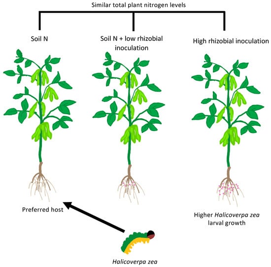 Not only can rhizobia prime their hosts against microbial pathogens in a number of cases, but they have also been found to potentially offer anti-herbivory features. In [84], differing levels of Bradyrhizobium japonicum inoculation of Glycine max (soybean) were carried out, with plants also grown on different levels of soil N; high soil N and high rhizobial inoculation led to similar amounts of plant % total N. After 5 weeks of growth, plants were then infected with Halicoverpa zea (soybean podworm). It was found that the larvae preferred the plants with lower rhizobial colonisation, despite all plants having similar total N levels and regardless of the origin of the N (taken up from soil or fixed via rhizobia). This was also surprising as H. zea larvae had higher growth rates in plants with high levels of rhizobial inoculation (0.881 ± 0.059 g/g/day) compared to high soil N (0.677 ± 0.051 g/g/day). This could potentially be due the rhizobial-related fixed N, but also other rhizobial plant growth promotion activities leading to increased nutritional quality, such as carbohydrates and phosphates in the plant. Such improvements in plant nutrition have been found for Rhizobium radiobacter inoculation of lettuce [85].
