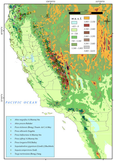 California was a prolific timber producer in the 20th century, and many of the conifers are of great economic importance today [54]. Giant redwoods have imposing massive trunks that are of great importance to the tourism industry. They have made California’s majestic forests famous all over the world [55]. The coniferous forests of California became increasingly interesting both culturally and scientifically.