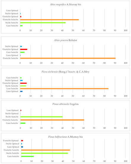 The assessment and prediction of bioclimatic parameters and indices that characterise and define plant communities could provide valuable information for planners and policy makers to deal with the consequences of climate change [72]. In this way, this research can help environmental managers throughout their local area [73] to take strategic measures to mitigate and anticipate the adverse effects of global warming on the loss of habitat suitability for the conifer species studied.