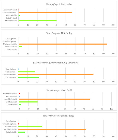 Individual species only thrive within certain ranges of environmental conditions [113,114]. Therefore, mapping the suitability of habitats for different plant species can help to identify areas that may be more resilient to the effects of climate change [115,116]. To achieve one of the objectives of this research, we defined suitable areas (based on the maximum and minimum values of each species for each of the variables) and optimal areas (based on the values between the first quartile (Q1) and third quartile (Q3) of each species for each of the variables) at the present time (1980–2019) and their projection into the future (2050).