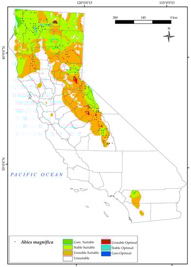 The red fir dominates the upland areas of California and has been a forest species of great importance in the state, as the wood is used in general construction [54]. It generally lives in a cold, moist environment with abundant precipitation (556.2–929.9 mm) in the form of snow. The soils on which it grows are young and in the order of Entisols, Inceptisols, and Alfisols [83]. This tree is a dominant species in most of the territory, sharing vegetation cover with Abies concolor Lindl. & Gordon, Pinus contorta Bol. and Pinus jeffreyi A. Murray. In the Shasta Mountains, it is found with Abies procera Rehder and Pinus balfouriana A. Murray bis [84].