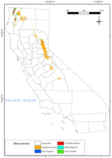 This species is the characteristic of Tsugo mertensianae−Abietetum procerae Rivas−Martínez, Sánchez−Mata & Costa 1999, which grows throughout the Cascade Range Sector territories [120]. Although this plant community has previously been characterised as Temperate oceanic [120], it is noteworthy that A. procera in California is predominantly Mediterranean in our results.