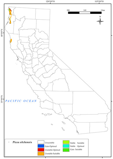 This species is associated with Sequoia sempervirens Endl. in some parts of its distribution [81]. Sitka spruce exhibits a wide range of variation in adaptive traits and has shown a high capacity to respond to selection and adapt to past climate change along the Pacific coast of North America [121].