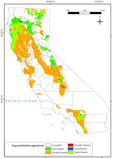 Former research has used Thornthwaite methodology to describe the distribution of tree species in Yosemite Park [33]. However, this paper goes further and, to the best of our knowledge, is the first to analyse the whole state of California applying the Worldwide Bioclimatic Classification System methodology [48]. In this respect, the quantitative bioclimatic characterisation is accomplished as a novelty. Lastly, it is noteworthy that very little research has been conducted on the impact of climate change on the distribution of the taxa studied.