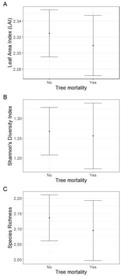 There were negligible effects of tree mortality on (A) Leaf Area Index (LAI), (B) Shannon’s diversity index, or (C) species richness when comparing the mean fixed effects and standard error estimates.