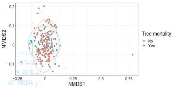 The effect of tree mortality was negligible on Leaf Area Index (LAI) (fixed effect = −0.02, standard error = 0.03, t = −0.46; Figure 2A), Shannon’s diversity index (fixed effect = −0.01, standard error = 0.08, t = −0.15; Figure 2B) or species richness (fixed effect = −0.04, standard error = 0.09, t = −0.47) (Figure 2C). Further, tree mortality did not appear to have a marked effect on the grouping of plots based on species composition using nMDS analysis (k = 2, stress = 0.22; Figure 3), nor was it observed to have a significant effect using a PerMANOVA analysis (F = 1.60, p = 0.14).