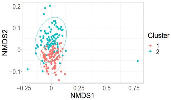 The effect of LAI was negligible on both Shannon’s diversity index (fixed effect = −0.03, standard error = 0.04, t = −0.88) and on species richness (fixed effect = −0.06, standard error = 0.04, t = −1.37) (Appendix A, Figure A1). This was supported by multivariate analysis. LAI did not appear to markedly affect the grouping of plots based on species composition using nMDS analysis (k = 2, stress = 0.22; Appendix B, Figure A2). Two clusters of plots based on species composition were determined using cluster analysis. A significant difference between the two clusters (F = 23.61, p < 0.01) was observed using perMANOVA analysis and highlighted when groups were overlaid on the nMDS plot (Figure 4). This clustering was driven by a difference in species richness, as highlighted by a significant effect of group on species richness (F = 8.92, p < 0.01) and Shannon’s richness index (F = 11.64, p < 0.01) using linear mixed-effects models. Indicator species analysis suggested that several species were significant drivers of the clustering. The key driver of group 1 was Acmena smithii (Poir.) Merr. & L.M. Perry (InVal = 0.67, p < 0.01). While key drivers of group 2 were Syzygium oleosum (F. Muell.) B.Hyland (InVal = 0.63, p < 0.01), Glochidion ferdinandi (Müll.Arg.) F.M. Bailey (InVal = 0.62, p < 0.01), Elaeocarpus obovatus G. Don (InVal = 0.43, p < 0.01), Cryptocarya microneura Meisn. (InVal = 0.40, p < 0.01), Acacia disparrima M.W. McDonald & Maslin (InVal = 0.32, p < 0.01), Gossia hillii (InVal = 0.29, p = 0.01), Toona ciliata M. Roem. (InVal = 0.28, p = 0.04), Wilkiea huegeliana (Tul.) A.DC. (InVal = 0.27, p = 0.03) and Cryptocarya laevigata Blume (InVal = 0.26, p = 0.01).