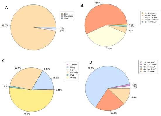 Key reproductive and dispersal traits associated with cross-trophic-level interactions were identified from the literature (seed size, fruit size, fruit type, and dispersal mechanism) [,,]. Seed size categories and fruit size categories were extracted from the same sources (fruit size dimensions of 1 = ‘<2 mm × <2 mm’, 2 = ‘2–5 mm × 2–5 mm’, 3 = ‘6–15 mm × 6–15 mm’, 4 = ‘16–25 mm × 16–25 mm’, 5 = ‘26–100 mm × 26–100 mm’, 6 = ‘>100 mm in any dimension’, and seed size dimensions of 1 = ‘0–1 mm × 0–1 mm’, 2 = ‘1·1–3 mm × 1·1–3 mm’, 3 = ‘4–8 mm × 4–8 mm’, 4 = ‘9–12 mm × 9–12 mm’, 5 = ‘>13 mm in any dimension’). Trait values for each species were determined in a literature review [,,,,,,,,,,], and in some cases, expert advice was needed to determine dispersal mechanisms (Catterall, C.P. 2022, personal communication) (Appendix H, Table A2). Where size ranges were quoted, the largest value was taken, and where there was variation between sources, the median was used.