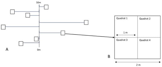Diagram highlighting an example of the random placement of plots with reference to a line transect (A) and plots comprising four quadrats (B).