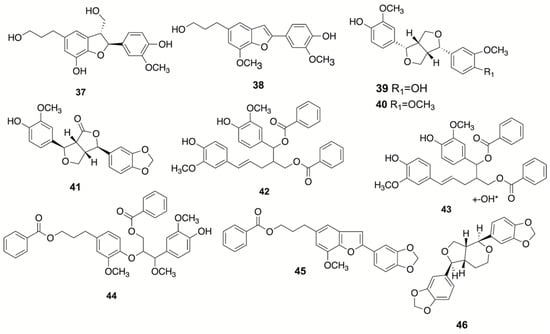 | 45 | 5-(3’’-benzoyl-oxypropyl)-7-methoxy-2-(3’,4’-methylenedioxy phenyl) benzofuran | Lignan (benzofuran lignan) | [4] |