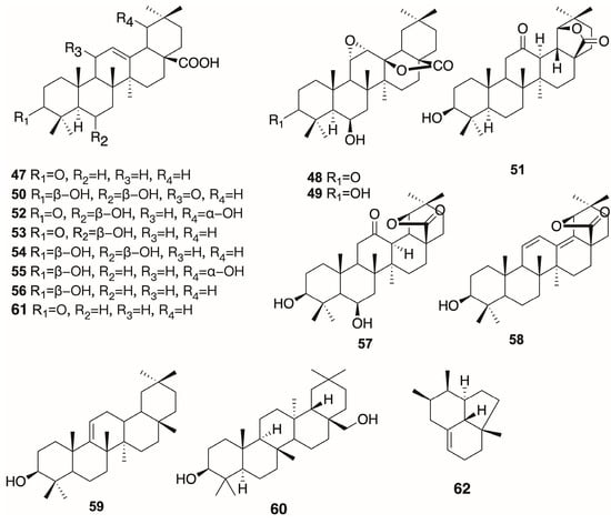 | 48 | 6β-hydroxy-3-oxo-11α,12α-epoxyolean-28,13β-olide | Triterpenoid | [29] |