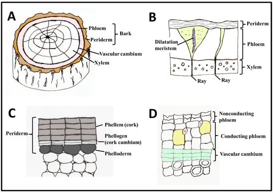 The bark (the cortex and epidermis in primary growth, and all the tissues outside the cambium in secondary growth), can be divided into inner and outer bark according to their developmental origin and status [1]. The cortex and epidermis that serve as primary bark is found only in young shoots, in thin roots, or in lineages that lack secondary growth (e.g., non-Asparagalean monocots). In shoots and roots that express cambial activity for a long time, the primary bark remains on the outer side, and it is commonly shed when the trunks become very thick. While the cortex and epidermis (all tissues outside the vascular cylinder) is produced by two primary apical meristems (ground meristem and protoderm, respectively) [1], the secondary bark is always the product of the activity of two secondary lateral meristems—the vascular cambium and the phellogen [1] (Figure 1). In many species, including herbaceous ones, another secondary process follows the increase in girth, causing cracks in the bark, a phenomenon known as dilatation. It may occur via cell expansion, random divisions, or via the activity of a dilatation meristem [2] (Figure 1B) (see below). The bark often includes cortex remnants, and consists of the secondary phloem, and a periderm or, in many cases, sequent periderms (rhytidome) and the tissues embedded in between them. All tissues found outwards the innermost periderm are considered as rhytidome [1]. Therefore, tissues such as the cortex and old phloem can within time be encapsulated by the periderms, and become part of the rhytidome.