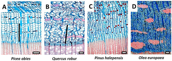 Different structure of conducting phloem growth rings in temperate vs. Mediterranean species. Visible phloem growth rings (black line) in temperate tree species Picea abies (A) and Quercus robur (B), while in the Mediterranean species Pinus halepensis (C) and Olea europaea (D), the demarcation of the youngest growth rings is not feasible. Scale bars = 100 µm.