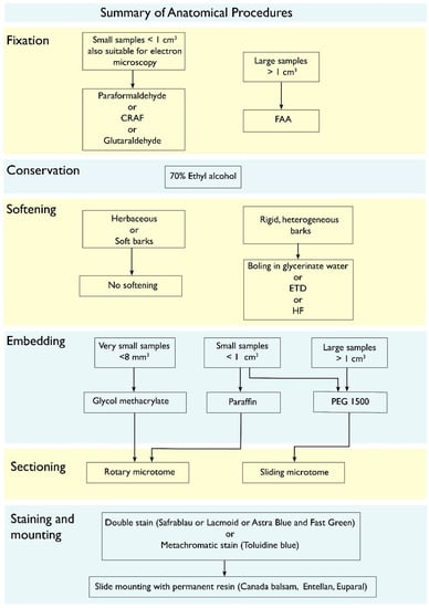 The first step is always fixing the collected bark samples in liquid. Fixatives such as paraformaldehyde or FAA (10% formaldehyde, 5% acetic acid, 70% ethyl alcohol [84]) can be used depending on the size of the sample (see flowchart for deciding), but in the absence of one of them, even common ethyl alcohol is better than drying. The sooner the material is fixed, the better, for the phloem tends to rapidly collapse. If a vacuum chamber is available, it is highly recommended, since it forces the fixative inside the sample yielding better fixation. After a couple of days, the material can be transferred to 70% ethanol and conserved for as long as necessary. Herbaceous and soft barks do not need softening, but barks that combine sclerenchyma with non-lignified cells are better sectioned after softening, which can be done by boiling in water with some glycerin (10 mL/liter), which is a gentler method, or with the use of softening chemicals, such as ethylenediamine (ETD) or hydrofluoric acid. ETD is preferred, since hydrofluoric acid is extremely hazardous [85]. Usually a couple of days in 10% ETD is sufficient for making the tissue more manageable for sectioning [86], and the solution can be reused many times, even if getting very dark [85]. Embedding the samples is another step that greatly improves the quality of the sections. If embedding in paraffin or glycol methacrylate, a rotary microtome will be used for sectioning, while if using polyethylene glycol (PEG 1500), a sliding microtome will be used instead. The advantages of PEG 1500 are that it is water soluble and does not make lignified samples harder. PEG 1500 has in addition excellent penetration, and large samples can be embedded, even entire branches [87,88]. If working in a very humid environment, the addition of a 10% PEG 4000 on the last stage of the process helps making the block less prone to absorbing room humidity and easier to handle. To perform the sections, it is recommendable to use of a polystyrene resin made of Styrofoam dissolved in either xylene or butyl acetate, which is applied upon the sample as a coat that holds the section together, avoiding tearing while facilitating sectioning, staining and dehydrating [89].