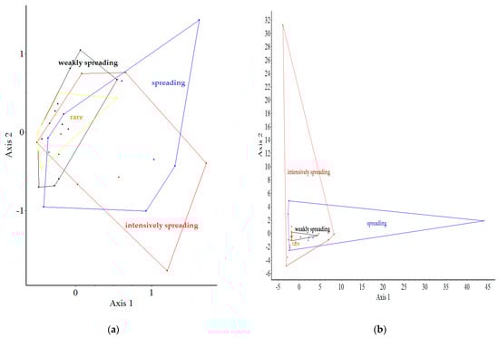 - Category III—Weakly spreading, and taxa with a low distribution (10–49);