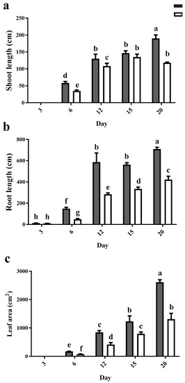 Under control conditions, shoot and root length increased as expected over the course of 20 days. Cd caused negative effects on both root and shoot lengths when compared to the control plants at each time-point (Figure 1a,b). Similar results were obtained in the leaf area (LA); the LA in Cd-exposed plants was half of that in control at all time points (Figure 1c).
