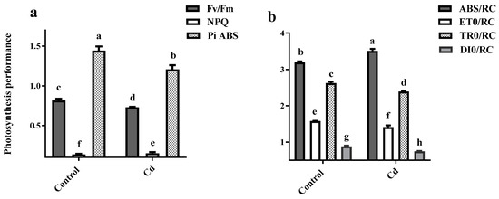 Photosynthetic performance—including Fv/Fm, NPQ and PiAbs—was significantly reduced (nearly 15%) as a result of the Cd application (Figure 3a). ABS/RC increased by 15% in plants exposed to Cd, however, a nearly 10% reduction was observed in ET0/RC and TR0/RC and DI0/RC by Cd application (Figure 3b).