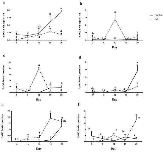 In contrast with other PAO genes, under control conditions, PAO6 was significantly reduced till day 12; however, an increase was detected at 15 and 20 days afterwards. In the opposite manner, Cd exposure suppressed PAO6 expression on day 3 and thereafter an increase (6 times) until day 12 was observed. On day 15 under Cd shock, PAO6 expression reduced 3 times, followed by a sharp increase (5 times) on day 20 (Figure 4f).