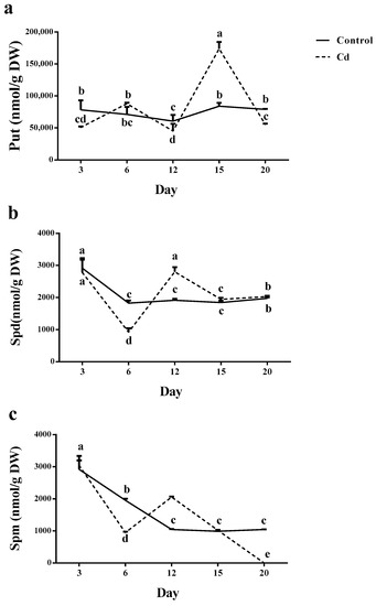 Total Put did not change in control plants during the 20 days; however, in Cd-exposed plants, the first induction was observed on day 6 and the maximum amount was recorded on day 15. In the rest dates, the total Put remained at the same value (Figure 5a).