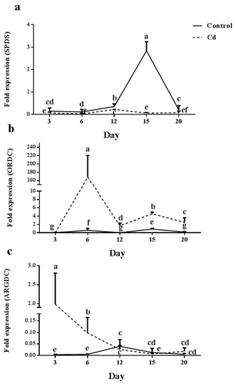 SPDS gene expression increased in a time-dependent manner under control conditions until day 15. However, its expression was reduced on day 20. In plants grown under Cd shock, SPDS expression was reduced through day 6 and showed significant expression on day 12; however, its expression level was still lower than control plants. A further dramatic reduction was recorded in SPDS on days 15 and 20 (Figure 6a). ORDC gene expression was significantly increased on day 6 in control plants. However, a dramatic reduction was recorded on day 12, followed by an increase on day 15. In plants treated with Cd, a significant increase (150 times) was observed on day 6, however, a further dramatic reduction was detected (70 times) on day 12. Later on day 15, a two times increase was followed by a reduced expression on day 20 (Figure 6b). ARGDC expression remained steady in control plants at all time points except for day 12, which showed a significant induction. By contrast, in plants treated with Cd, ARGDC expression was abundantly high on day 3 and reduced in a time-dependent manner afterwards (Figure 6c).