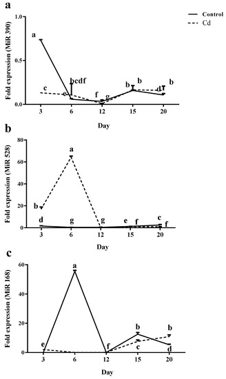 For control plants, miR528 expression levels were steady at all time points. By contrast, in Cd-exposed plants, a significant induction of miR528 was observed from day 3 to day 6; however, its expression level was reduced later on days 12, 15 and 20 (Figure 7b).