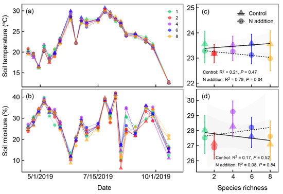 Soil temperature (°C, at a depth of 10 cm) (a) and soil moisture (%, at a depth of 10 cm) (b) under different plant species richness and nitrogen addition levels from April to October 2019. Mean (±se, n = 4 or 8) soil temperature (c) and soil moisture (d) for the whole growing season along the plant species richness gradients under different nitrogen (N) addition levels in 2019. We applied the ordinary linear regression analysis to test the dynamic of soil temperature and soil moisture along plant species richness gradients. Points and lines with different shapes represent different nitrogen addition levels, and points with different colors represent different plant species richness levels.