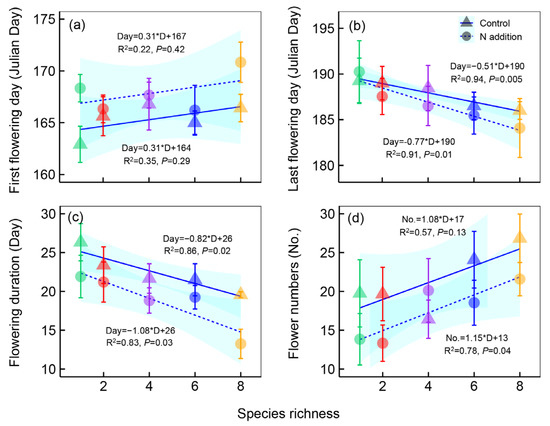 The first flowering day (a), last flowering day (b), flowering duration (c), and flower numbers (d) of Medicago sativa along the plant species richness gradients under different nitrogen (N) addition levels. All the analyses were performed using the ordinary linear regression analysis to test the dynamic of flower phenological events along plant species richness gradients. Points and lines with different shapes represent different N addition levels, and points with different colors represent different species richness levels. Shaded areas show 95% confidence intervals of the fit.