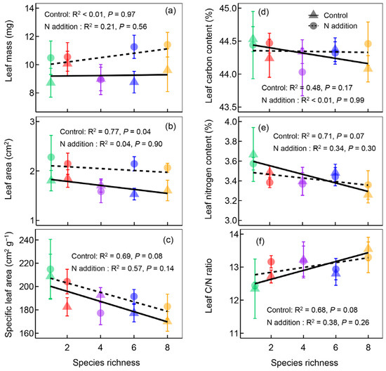 The leaf mass (a), leaf area (b), specific leaf area (c), leaf carbon content (d), leaf nitrogen content (e), and leaf carbon/nitrogen ratio (f) of Medicago sativa along the plant species richness gradients under different nitrogen (N) addition levels. Points and lines with different shapes represent different nitrogen addition levels, and points with different colors represent different plant species richness levels.