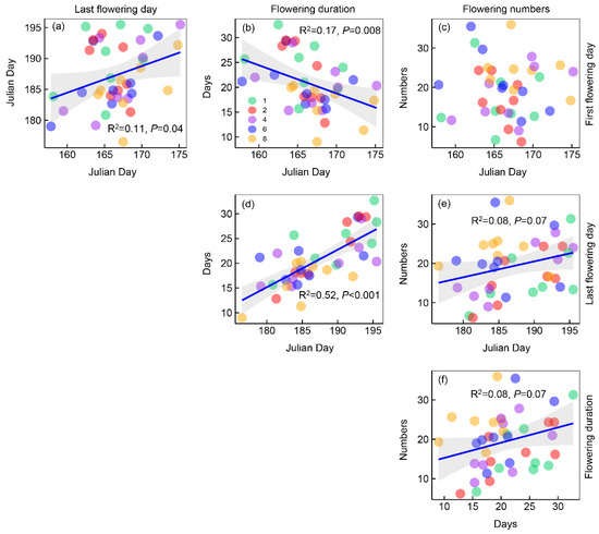 The last flowering day was positively correlated with the first flowering day significantly (Figure 4a); flowering duration was negatively correlated with the first flowering day and positively correlated with the last flowering day (Figure 4b,d); flower numbers were positively correlated with last flowering day and flowering duration (Figure 4e,f).