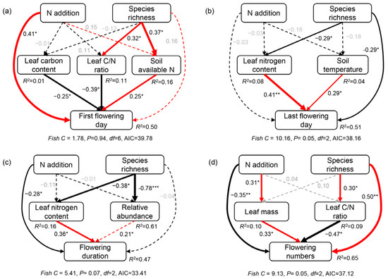 Structural equation modellings of plant species richness and nitrogen (N) addition impact on the first flowering day (a), last flowering day (b), flowering duration (c), and flower number (d). Red and black arrows represent significant positive and negative pathways, respectively. Solid and dashed arrows indicate significant and non-significant pathways, respectively. Numbers near the arrow indicate the standardized path coefficients indicating the effect size of the relationship with * indicating p < 0.05, ** indicating p < 0.01, and *** indicating p < 0.001. The arrow width is proportional to the strength of the relationship. R2 represents the proportion of variance explained for each dependent variable. The goodness-of-fit statistics for the structural equation modeling are shown below each model. C, carbon.