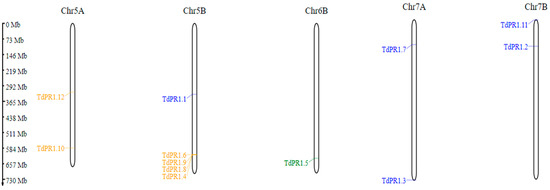 The genomic features of TdPR1 members are presented in Table 1. The distribution of TdPR-1 genes were on five different chromosomes. Two genes were located on Chr5A, Chr7A, and Chr7B, whereas only one gene was located on chromosome 6B. The rest (about a third of the selected genes) were clustered on chromosome 5B (Figure 2, Table 1).