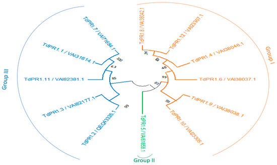 Phylogenetic reconstruction of PR-1 proteins from durum wheat. The phylogenetic tree was inferred to test maximum likelihood with 1000 bootstraps by MEGA 11. Group I present the acidic TdPR1 members in orange, Group II presents the basic TdPR1 members in green, and Group III presents the 2nd basic TdPR1 members in blue.