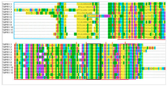 Based on the multiple alignment performed by the Muscle algorithm, we found that TdPR1 protein sequences are homologous. Indeed, the analysis indicated the presence of the Pfam0018 domain (CAP) in all the TdPR 1 proteins, (shown by red lines in the Figure 4). In addition, the blue box indicates the presence of the signal peptide (SP) regions (located at the N-terminal portion of the proteins; 24–31; Table 2). These peptides were found in all identified TdPR1 proteins except for TdPR1.3 and TdPR1.4. Moreover, only TdPR1.5 showed a cleavage site (between two alanine residues), whereas the others presented a common cleavage site between alanine (A) and glutamine (Q) amino-acid residues (Table 2).