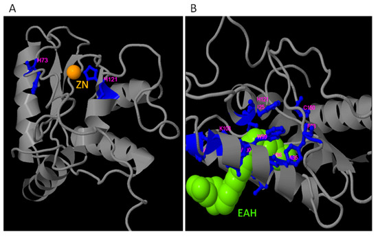 Localization of putative Zn (A) and EAH (B) binding sites in TdPR1.2 structure.