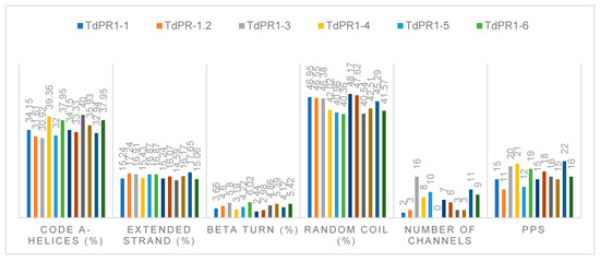 Secondary structures of proteins were predicted using the SOPMA server. The percentage of α-helices, extended strand, β turn, and random coil were 30.92–40, 14.59–18.08, 2.44–6.78, and 40.36–48.17, respectively. Structural conformation of a protein can occurs via protein phosphorylation by adding the phosphate groups to serine, threonine, or tyrosine residues [52]. Using the NetPhos 3.1 server, phosphorylation sites were predicted in TdPR1 proteins and ranged between 11 and 22 (Figure 7). The predicted channel number found in the studied TdPR1 proteins were registered between 0 and 16 (Figure 7).