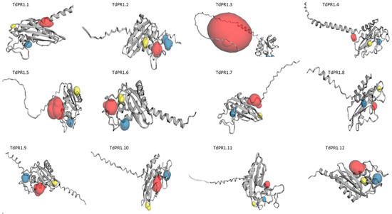 Predicted 3D structure of the TdPR1 proteins using the CASTp 3.0 server. The top three predicted pockets are indicated as red, blue, and yellow, respectively.