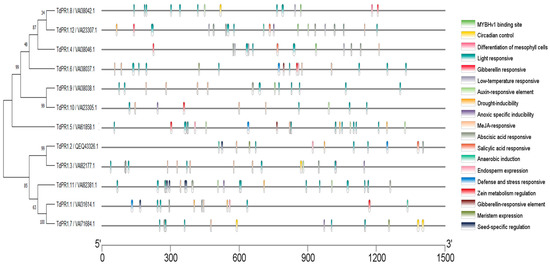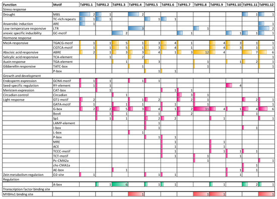 Representation of the cis-elements in the TdPR1 promoters using TBtools software v1.108. Each cis-element was identified by a unique color.