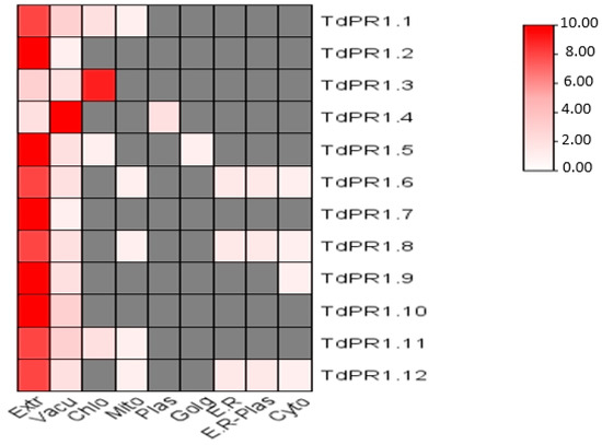 The subcellular localization of TdPR1 proteins performed by the online tool WoLF PSORT and represented by a heatmap graphic using Tbtools v1.108 are shown in Figure 11. Indeed, with a high level of prediction, 10 TdPR1 proteins were found to be located in the extracellular compartment. This subcellular location of PR1 is not only identified in the extracellular space but could also be in the extracellular, Vacuole, endoplasmic reticulum, endoplasmic reticulum plasma membrane, cytoplasm, and mitochondria.