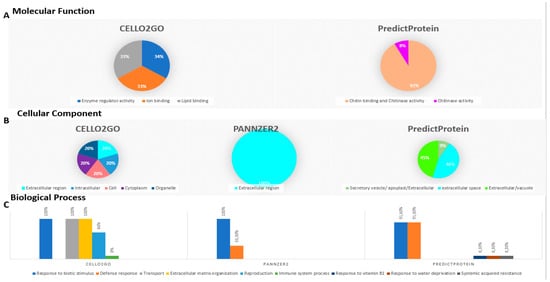 Comparative analysis of gene ontology (GO) by using three different online tools: CELLO2GO, PredictProtein, and PANNZER2. (A) Prediction of molecular function of TdPR1, (B) Cellular Component of PR1, and (C) Biological process predicted for the identified proteins.